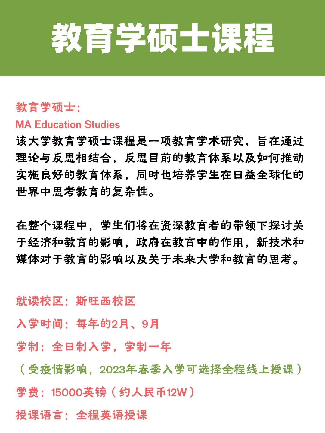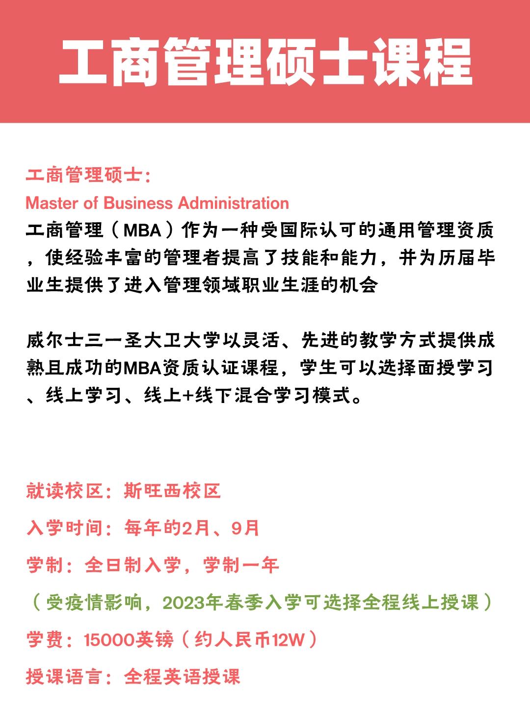 就读校区:斯旺西校区开学时间:每年的2月、9月学制:一年全日制学费:15000英镑(约12W人民币)1、受疫情影响,2023年春季入学的学生可选择全程线上学习,不用出境