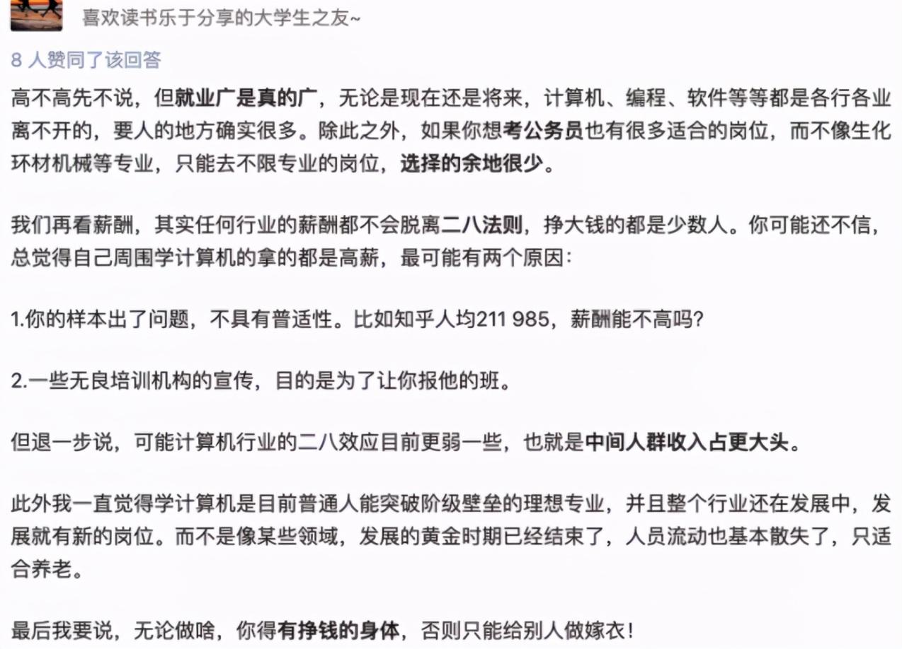 网友表示,任何行业的薪酬都不会脱离二八法则,挣大钱的都是少数人。但计算机行业的二八效应目前更弱一些,就是中间人群收入占更大头。