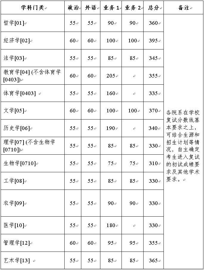 1.总分成绩不低于上表中复试分数线基本要求的总分,满分为100分的科目成绩不低于50分,满分为150分的科目成绩不低于75分,满分为200分的科目成绩不低于100分,满分为300分的科目成绩不低于150分,符合上述条件的考生可参加退役大学生士兵专项计划的复试。