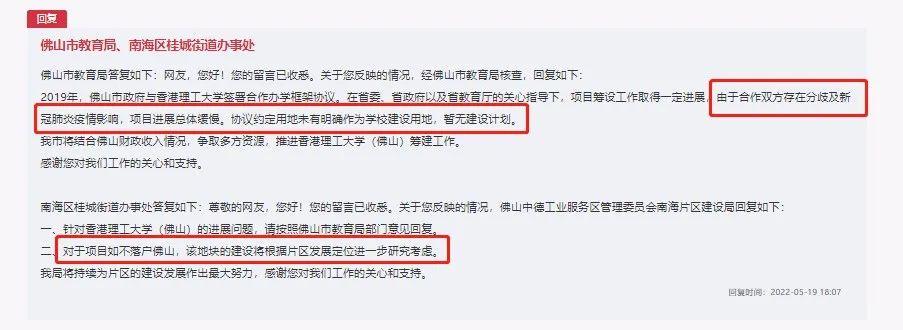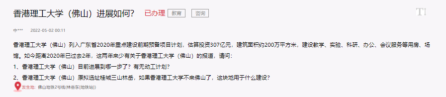 而另外一所新增大学——香港理工大学(佛山),该项目作为广东省2020年重点建设前期预备项目计划,在今年5月,有网友在领导留言板上留言:
