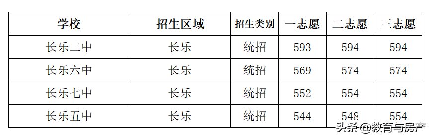虽然长乐并入市区录取已经两年,长乐的二、五、六、七中学虽然留出部分名额给五区学生,但还是专门留出足够的名额以飨当地子弟。对照上下两张图,我们可以看出长乐的二、五、六、七中学在五区收到分数线较高,这也以解读为市区的孩子为了拥有一个较好的学位,不惜东出鼓山,寄身长乐三年。长乐本地的孩子该不开心了,表上四所中学各拿到1/5的学位支援市区,导致本地上普高的最低分数线上升到544分!你说这并区到底好还是不好呢?