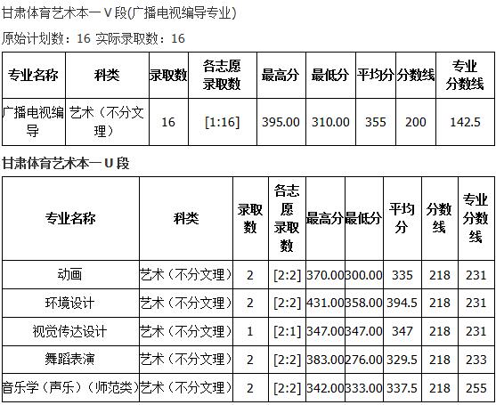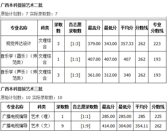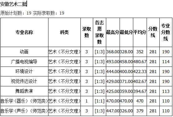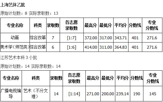 1. 设置了艺术类专业测试点的省(湖南、甘肃、江苏、福建、广西等五个省份广播电视编导),录取时使用学校专业测试合格成绩。要求考生达到生源所在省(直辖市、自治区)艺术类文化投档分数线,文理科考生一并排序,按专业成绩从高到低录取。若计划数最后一个遇上专业成绩并列,则按文化成绩从高分到低分录取,若文化成绩还相同,则以生源省(直辖市、自治区)投档排序依次录取。