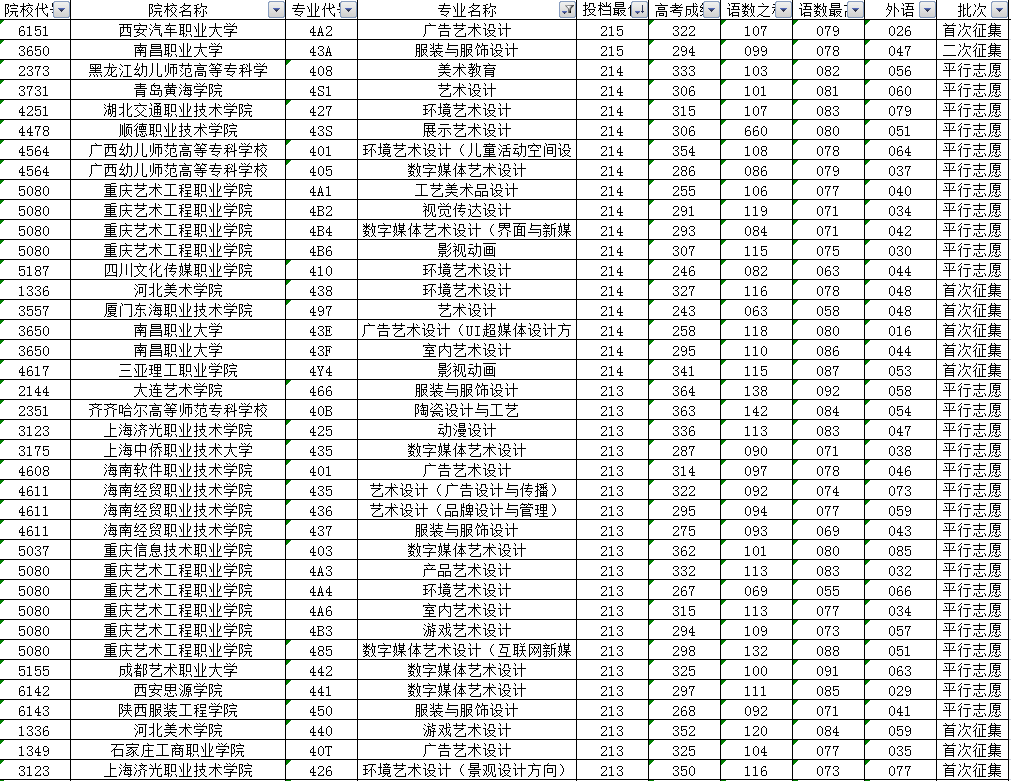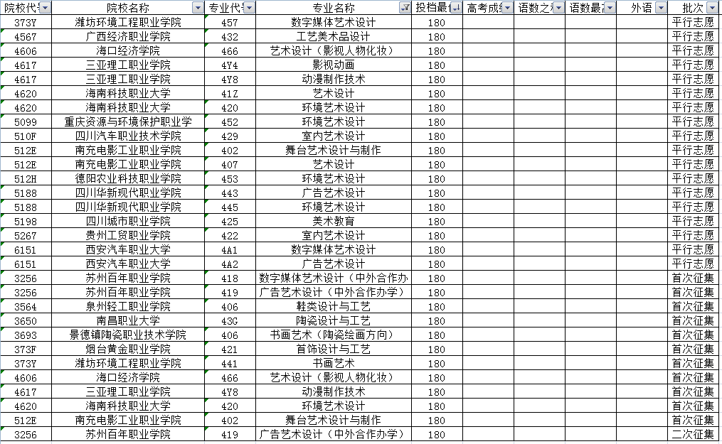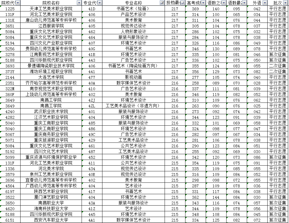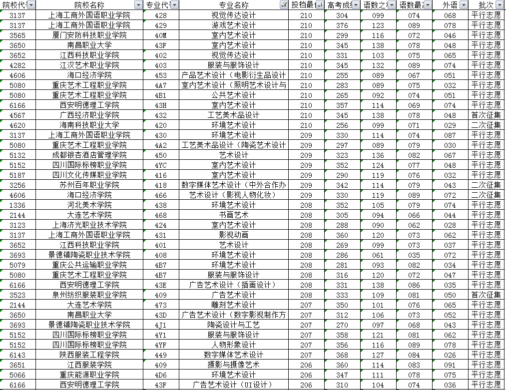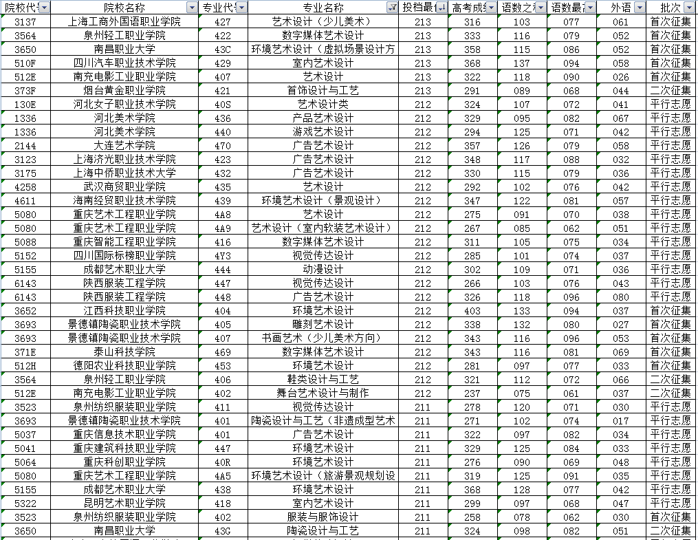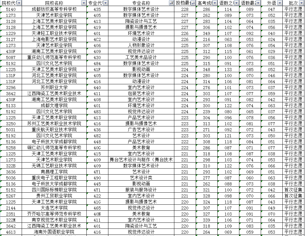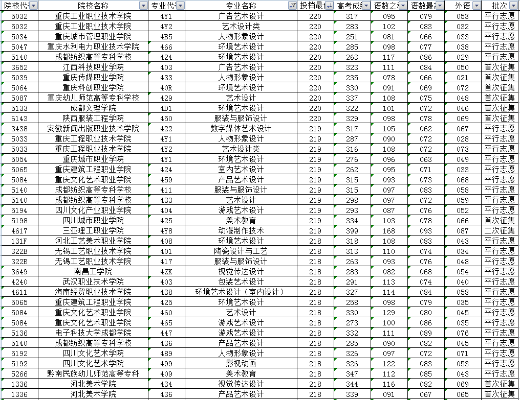 其他高校的投档最低分中,联考成绩高于240分的还有上海工艺美术职业学院、苏州职业大学以及成都大学等4所高校的7个专业。另外投档分居于前列的还有天津工艺美术职业学院、江西陶瓷工艺美术职业技术学院、成都纺织高等专科学校、四川大学锦江学院、河北工艺美术职业学院、湖南大众传媒职业技术学院、重庆幼儿师范高等专科学校、四川电影电视学院、成都东软学院等投档分在230分及以上。