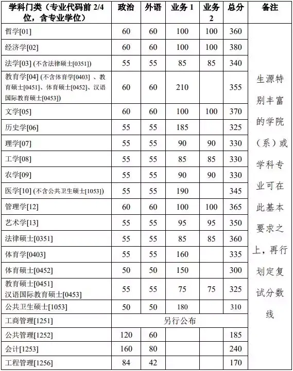 (二)上表所列分数线(管理类联考除外)满足以下情况视同上线:若单科低1分,总分相应高20分及以上;单科低2分,总分高25分及以上;以此类推,单科每低1分,总分相应再提高5分。但单科不得低于5分(含5分),且仅限1门单科。适用该政策上线的考生,总分相应扣减后计算各项排名。