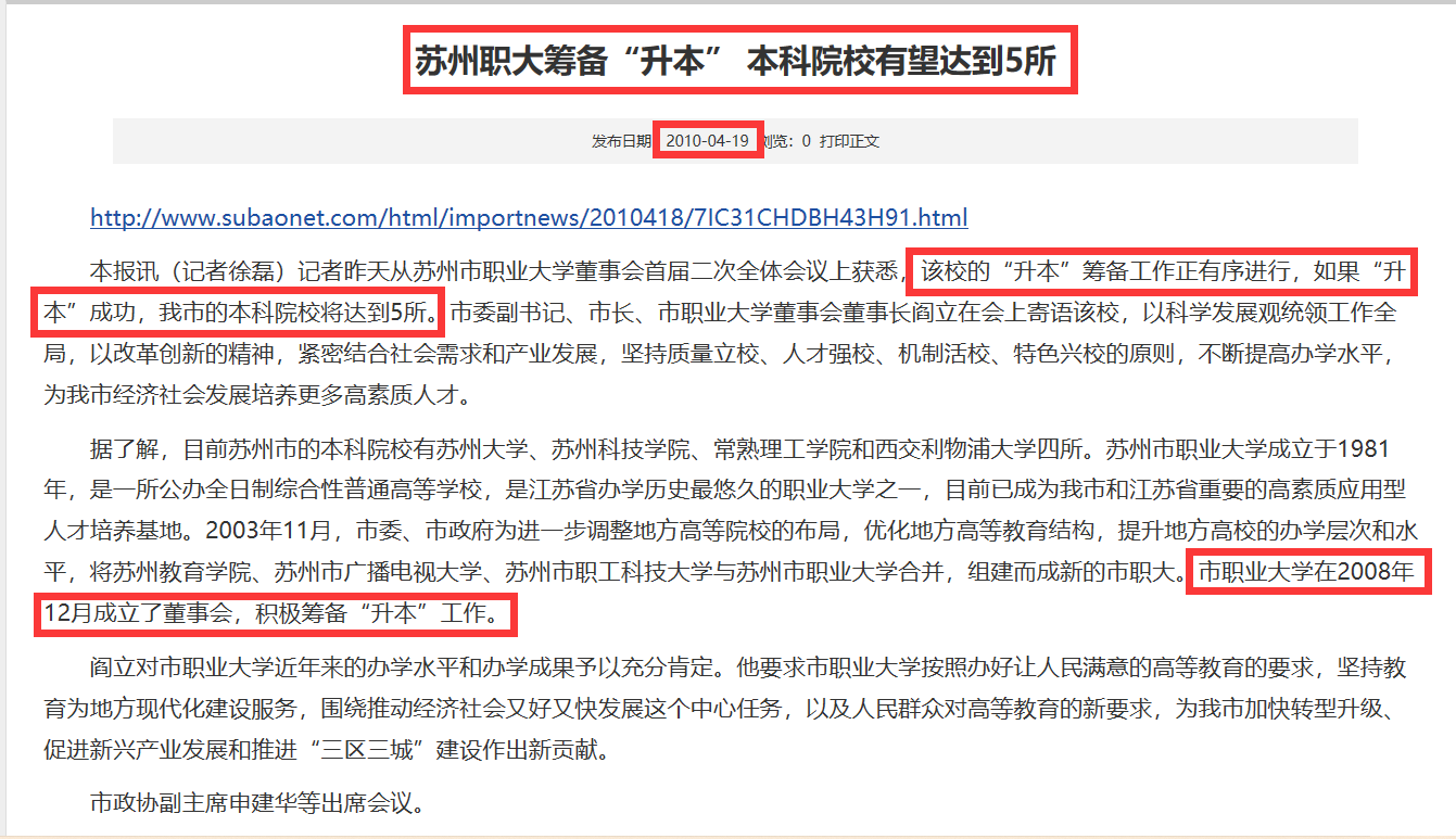 早在2008年,苏州市职业大学就成立董事会,积极筹备“升本”工作。到2010年,有新闻报道称,在苏州市职业大学董事会首届二次全体会议上,明确:学校“升本”筹备工作正有序进行。