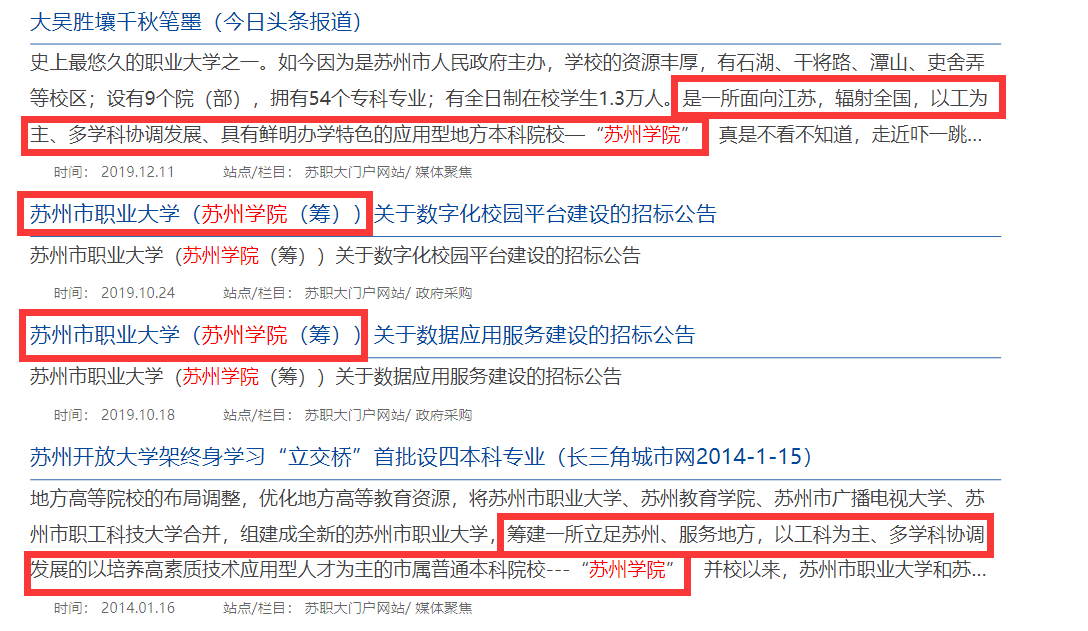 在这之后,该学校一直以苏州市职业大学(苏州学院(筹))的名义开展相关工作。如建设招标、官网建设、对外活动等,很多都有苏州市职业大学(苏州学院(筹))的字眼。从2008年苏州市职业大学筹划升本,至今已有14年,却未能成功,实属遗憾。