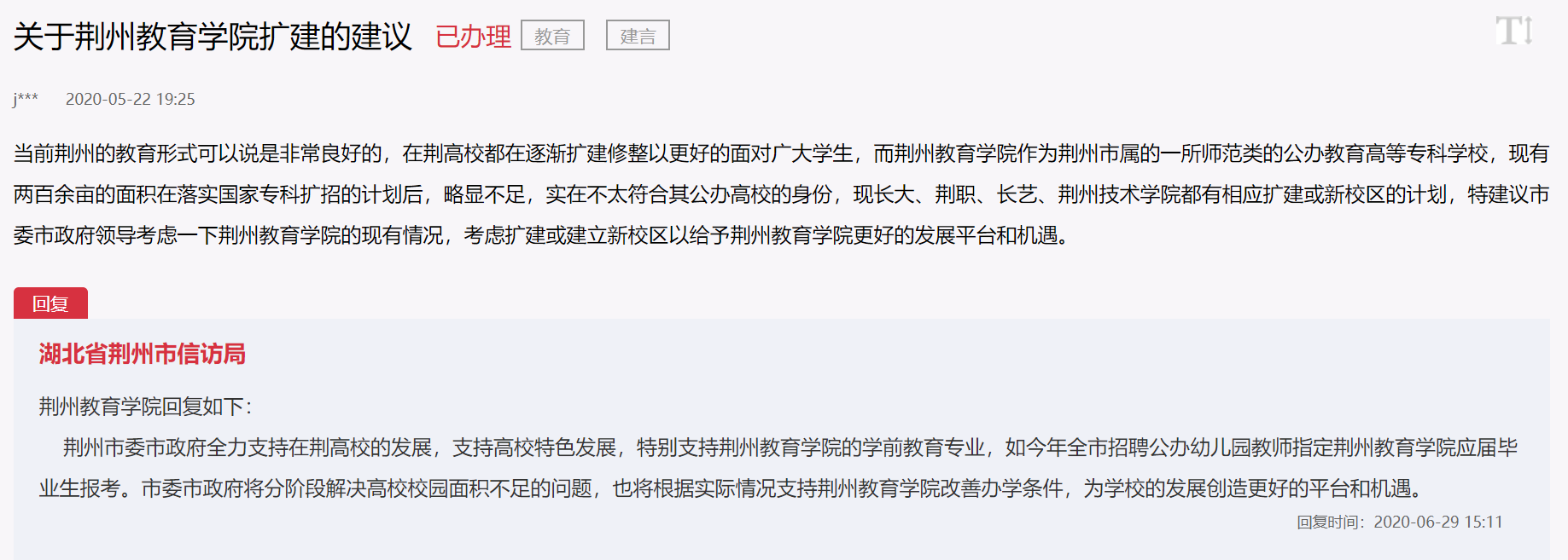 近日有人就荆州教育学院何时扩建新校区的问题,咨询职能部门。目前已经得到回复,具体回复如下: