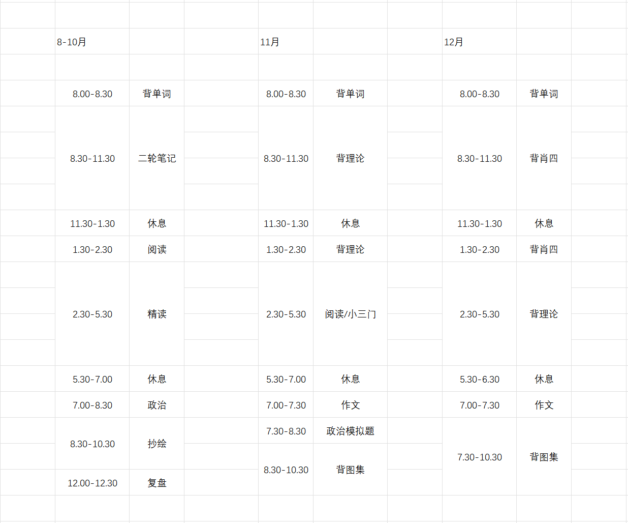12月冲刺的时候要模拟几次,建议给自己安排2小时50分去完成,习惯之后考试会压力小很多。一定记住英语要提前完成各项任务,除了作文,都要争取11月之前完成。后面进入11月分要把复习英语的时间转移到政治上。