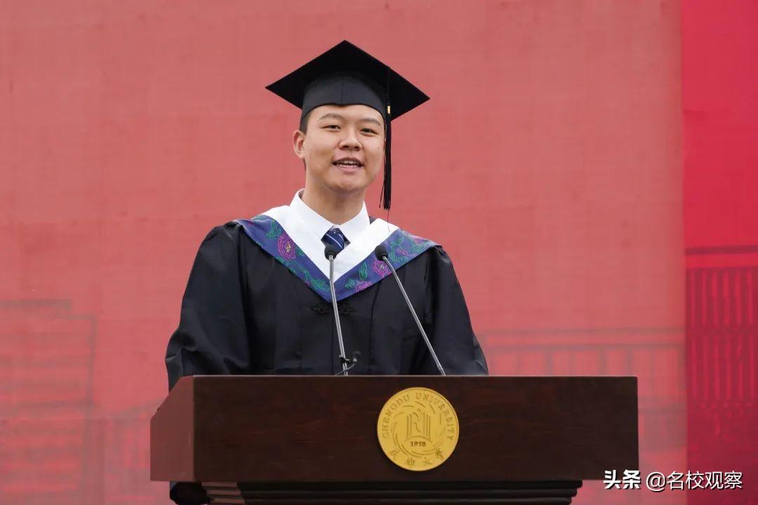 基础医学院何鑫磊同学作为毕业生代表发言,他回首在成大求学的五年时光,分享自我成长和蜕变、思考和收获。他说:“想都是问题、做才是答案,是成大告诉我普通人也能做出不普通的事,是学校提供的多样化发展平台上,让他创造条件一路追梦,最终走到了北大医学部;是在实习实践中走进大凉山的经历,让他深切感知基层群众冷暖,更加深刻地理解医学。“奋斗是青春最亮丽的底色,行动是青年最有效的磨砺。有责任有担当,青春才会闪光”,他号召毕业生们做起而行之的行动者、克难奋进的奋斗者,在这个充满无限机遇与可能的时代,“解锁”自己更多的可能性,创造人生的精彩。