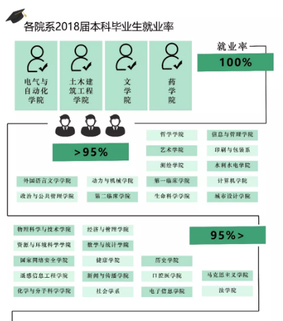 数据显示,2018年有本科毕业生的33个院系中,18个院系本科毕业生就业率达到95%以上,其中电气与自动化学院、土木建筑工程学院、文学院、药学院4个学院本科毕业生就业率达到100%。
