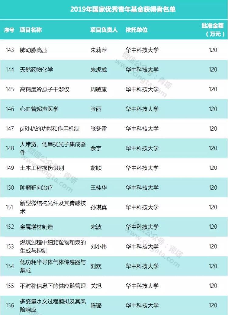 8月16日,2019年国家自然科学基金评审结果正式揭晓。国家自然科学基金委发布的公告表示,今年决定资助优秀青年科学基金项目600项,相比去年增加200项。华中科技大学共有14人入选,位列国内高校第8位,共获金额1680万元。