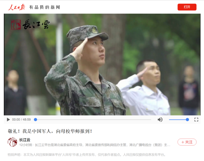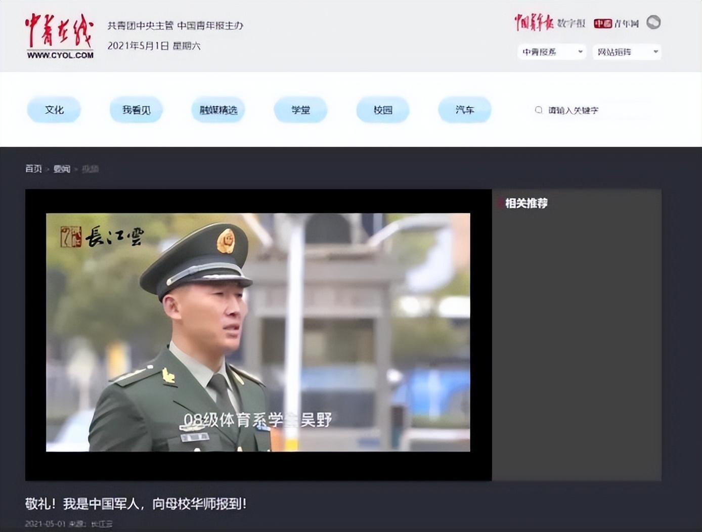 2022年5月1日,华中师范大学题为《敬礼!我是中国军人,向母校华师报到》的视频刷爆全网,视频中,身着笔挺军装的华中师大学子,目光坚定、步履沉着,一步步走向阔别已久的母校。学校参军入伍学生代表、武警某队中队长吴野在12年来,荣立二等功2次,三等功4次;参军入伍学生代表、音乐学院2018级本科生熊星,在部队两年时间,她参与近百场演出。该视频得到人民日报、央视频、新华网、光明网、中国青年网、人民日报海外网、环球网等多家主流媒体同步转载发布。