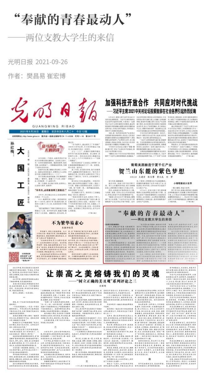2021年9月26日,《光明日报》头版刊登《“奉献的青春最动人”——两位支教大学生的来信》。信中,华中师范大学学子崔宏博讲述了他赴贵州省余庆县他山中学支教的故事。崔宏博为学校2019级土地资源管理方向硕士研究生、全国“青马工程”学员、学校第二十届研究生支教团团长,2018年8月至2019年7月在贵州省余庆县他山中学支教,担任高二年级地理教师、团委干事。