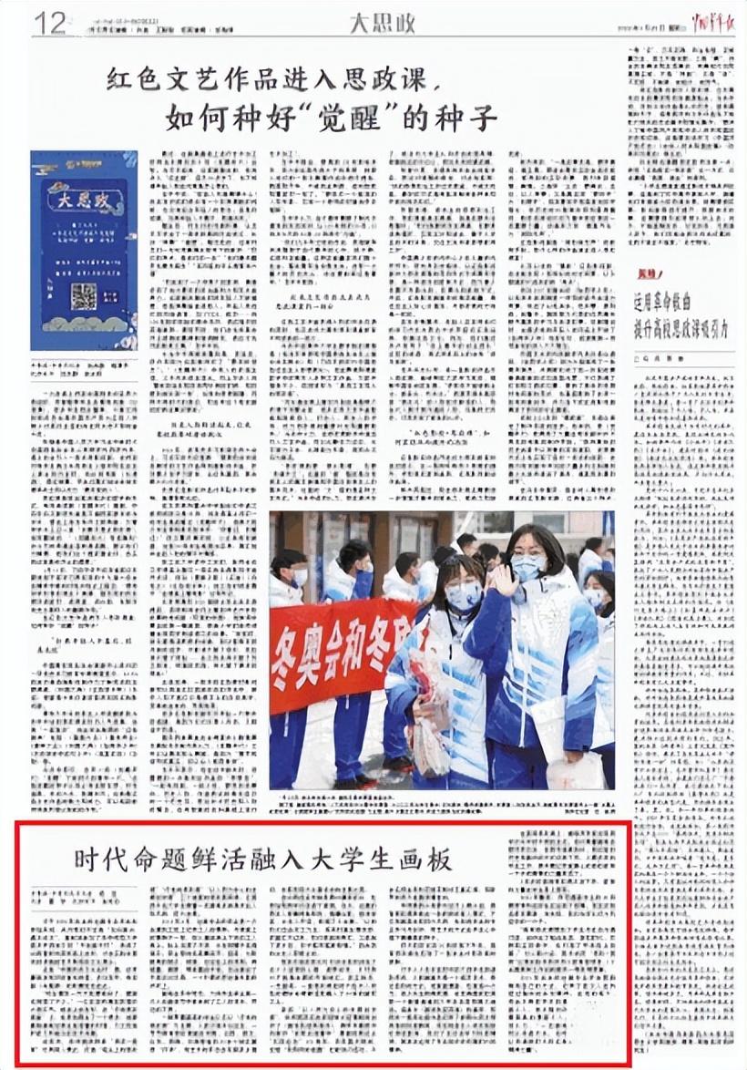 2022年01月25日 《中国青年报》12版以《时代命题鲜活融入大学生画板》为题报道了华中师范大学美术学院育人模式。近年来,学校美院探索“思政+美育”协同育人模式,打造“笔尖上的思政课”“行走的思政课”“以人民为中心的主题创作课”三个维度的思政美育课,让美院千名大学生带着一支画笔去亲身体验人物风貌、时代发展,同时也促进学生的专业学习与创作,用艺术的方式在学生心中埋下真善美的种子。