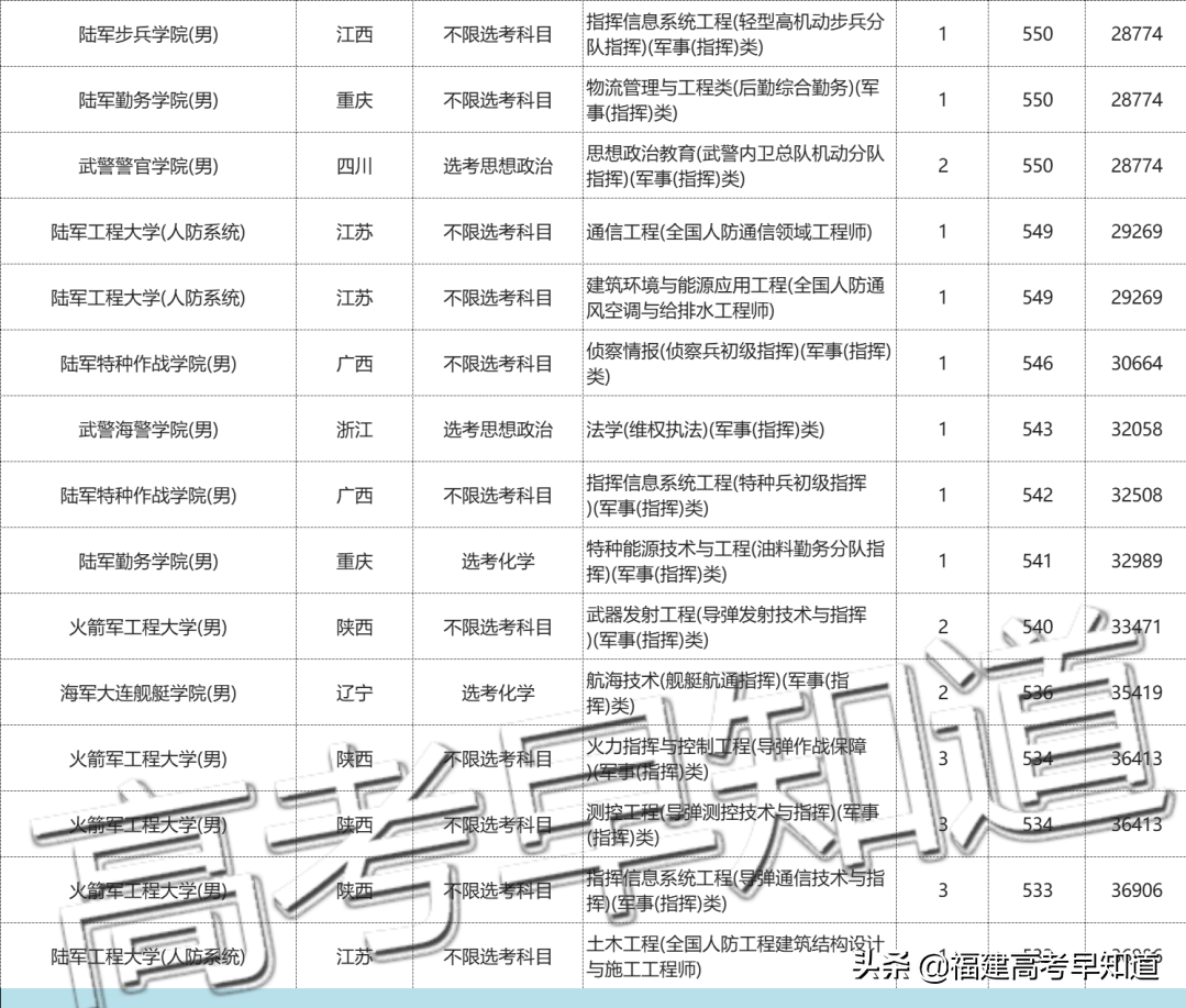1.军事院校:2017年起,停招国防生,军事院校有严格的政审考察和身体素质要求,但是考上军队院校后,学费全免,工作由学校根据专业和各大军区需要分配,去向涉及海陆空三军。