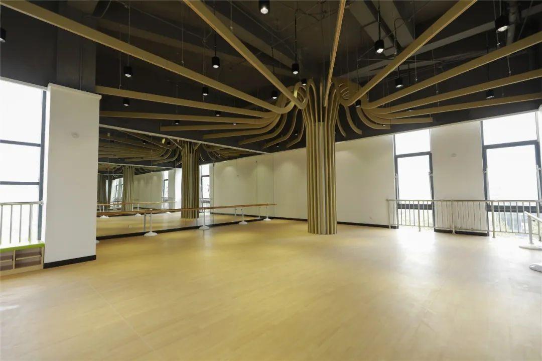 舞蹈教室别有风格,中间一棵充满艺术感的大树,四面镜子提升室内纵深感。