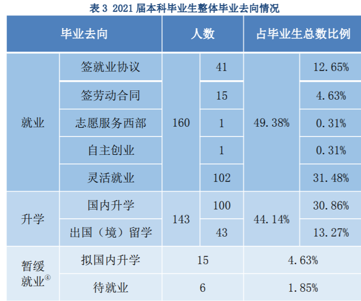 截至 2021年12 月 30 日,学院 2021届本科毕业生就业落实率为 93.52% ,其 中国内升学比率为 30.86%,出国(境)留学比率为 13.27%。