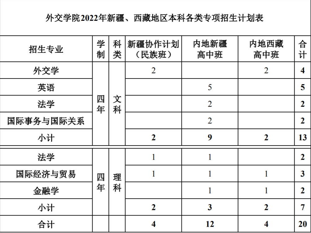 外交学院2022年新疆、西藏各专项计划招生情况一览