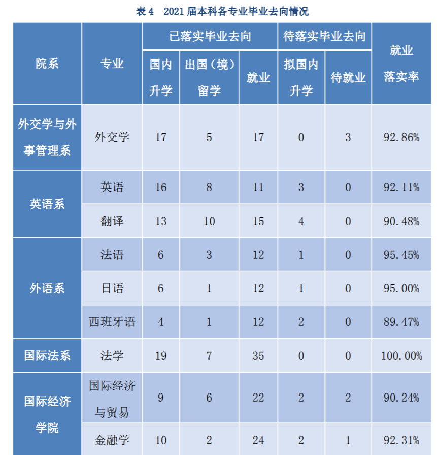 目前,各高校2022届毕业生毕业去向落实率等相关情况,还没有公布。这里,老马为您列出,外交学院2021届毕业生毕业去向落实率等相关情况,尤其是学校本科毕业生的升学、就业情况,供参考。