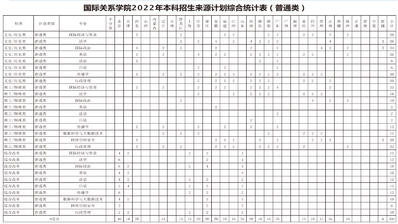 2022年,国际关系学院共计招生440人,其中,普通类394人,国家专项计划46人。