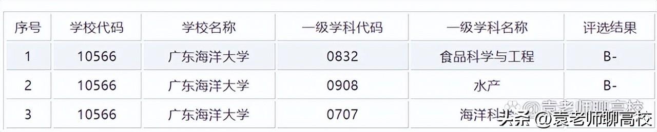在第四轮学科评估中,广东海洋大学有3个学科上榜,其中最强的学科是食品科学与工程和水产,这两个学科被评为B-,海洋科学被评为C+。