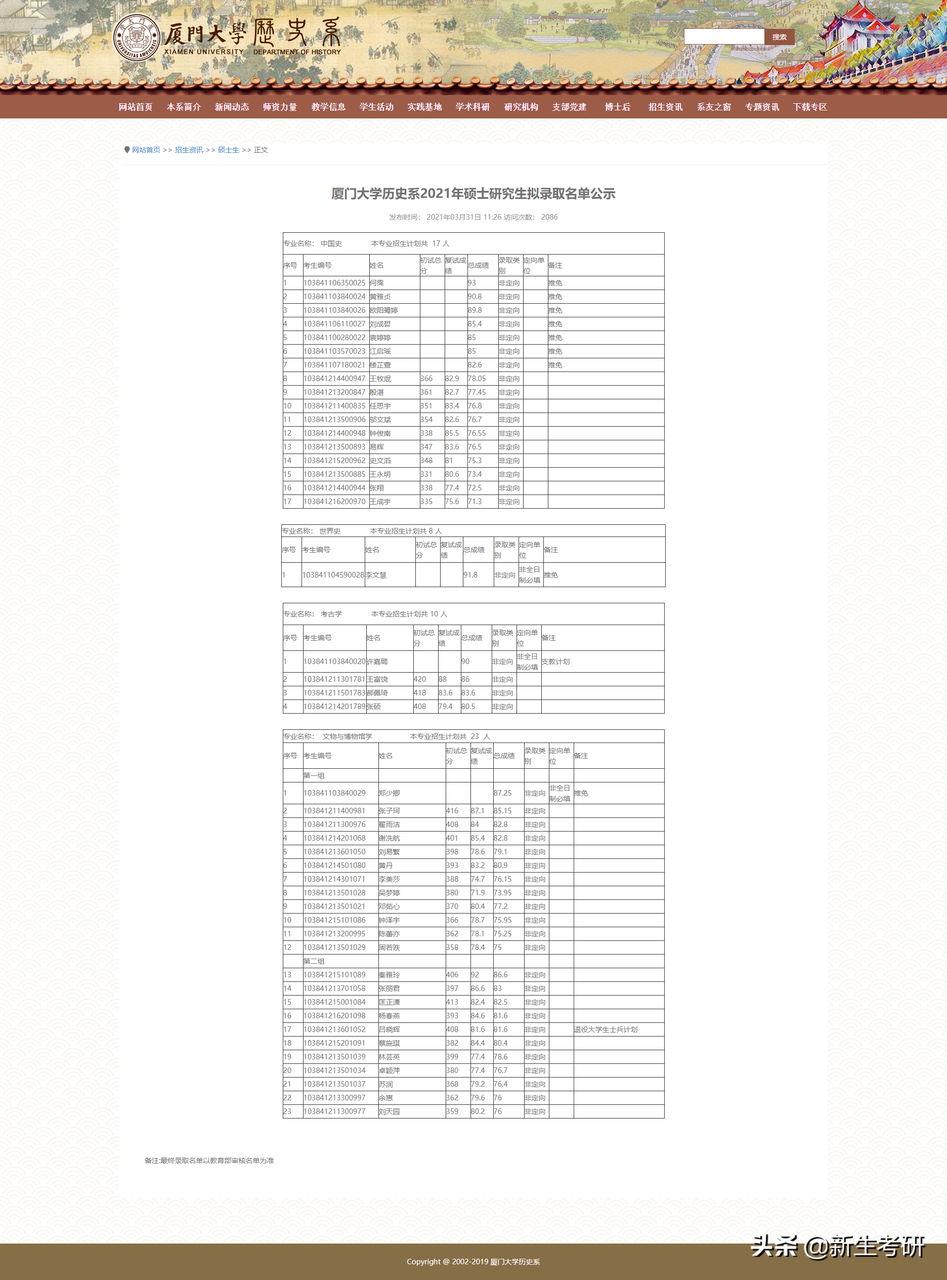 1、厦门大学历史系2021年硕士研究生拟录取名单公示