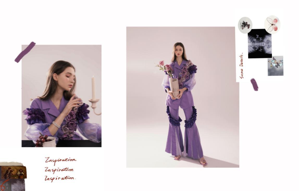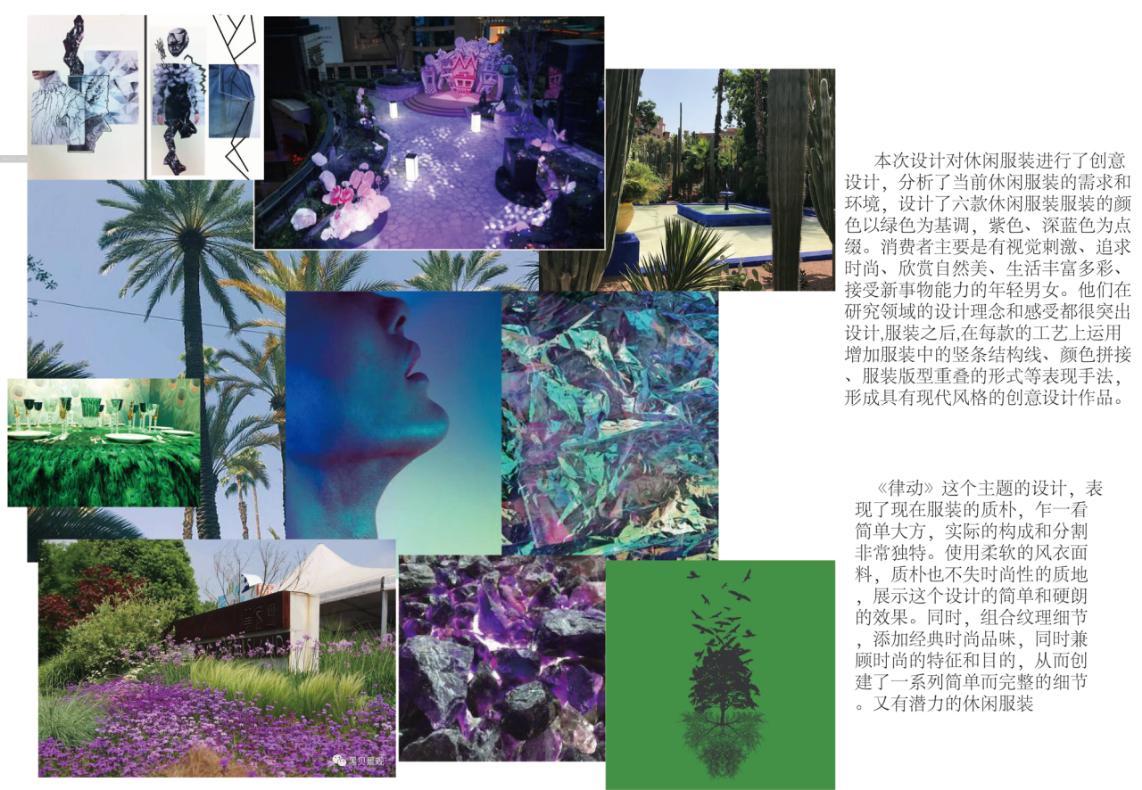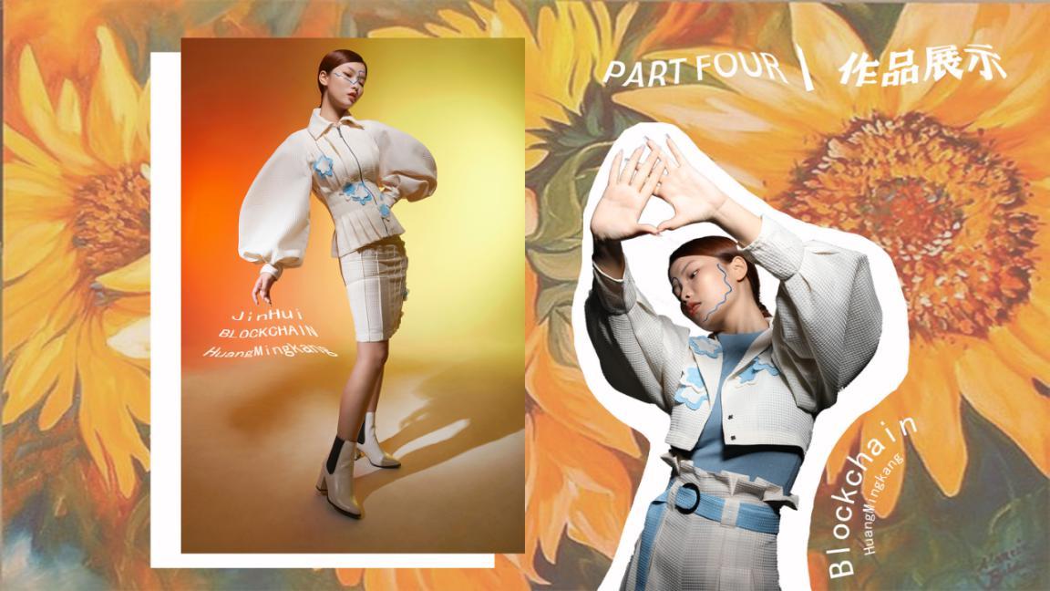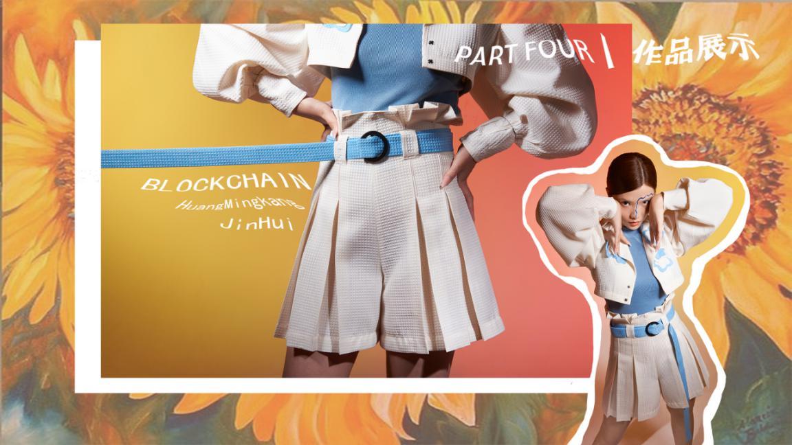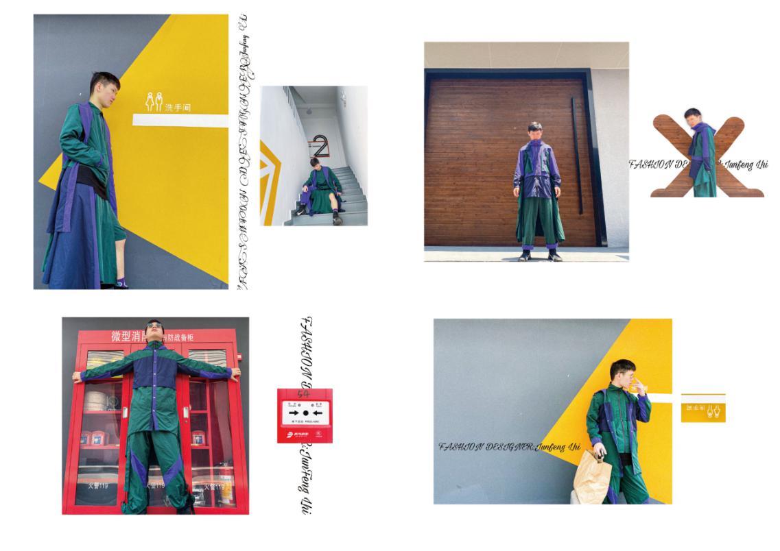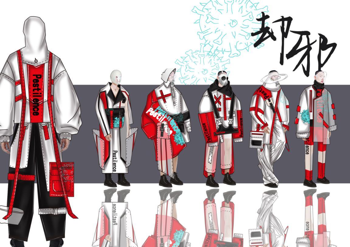 “以探索和应用针对新冠肺炎的安全防护元素,色彩结构和氛围,以营造一种既安全又环保的风格,并将其融入现代服装设计方案中。”