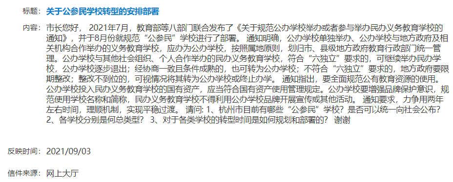 很多家长都关心的问题是杭州有哪些“公参民”学校,九月初也有家长就此问题对杭州市教育局进行了咨询:杭州有哪些是“公参民”学校?哪些民办会转公?哪些民办会停办?