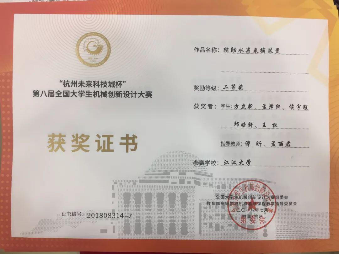 7月23日-25日,第八届全国大学生机械创新设计大赛决赛如期在浙江工业大学举行,潘云鹤院士,李培根院士邓宗全院士等机械领域知名学者和专家出席了开幕式。我校机电与建筑工程学院谭昕、孟丽君老师指导,方立新、孟泽轩、侯宇程、邱皓轩和王权5位同学制作的“辅助水果采摘装置”荣获全国二等奖。