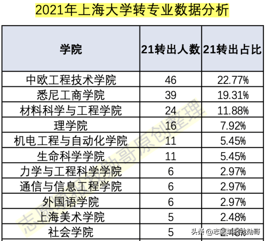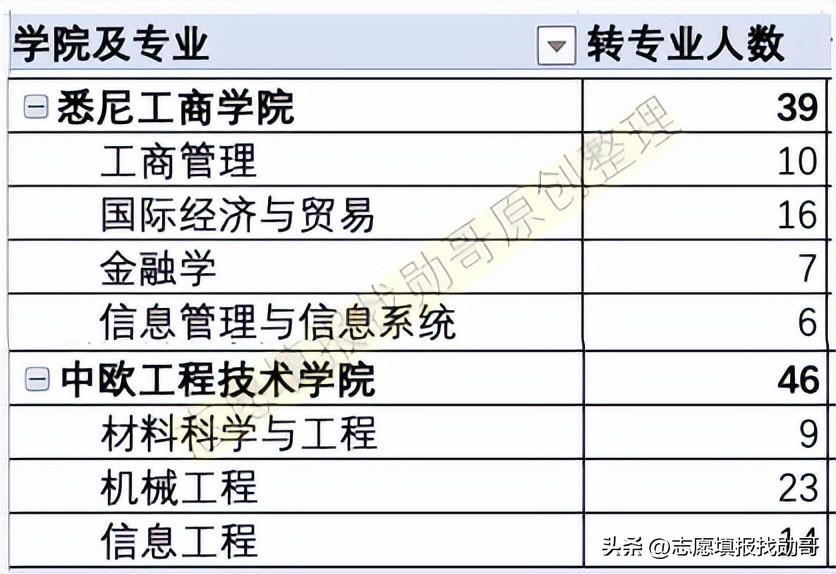 如下图所示:上海大学在2021年转专业总人数为2021 人,其中中欧工程技术学院和悉尼工商学院,加起来有85人,占了转专业人数的42%,这个比例是相当大了。