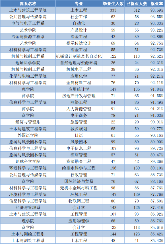 注:已就业包括签就业协议形式就业、签劳动合同形式就业、其他录用形式就业、国家基层项目、地方基层项目、升学、出国(境)、自主创业、自由职业、应征义务兵及科研助理;就业率=(已就业人数/毕业 生人数)×100.00%。