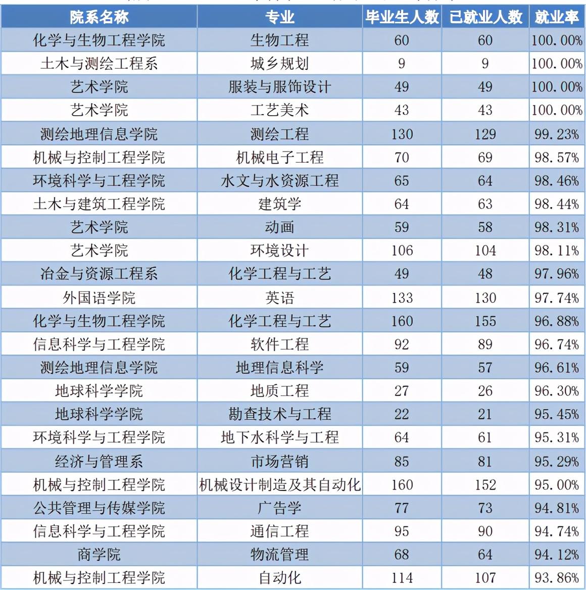 学校 2020 届本科毕业生分布在 20 个院系,其中测绘地理信息学院就业率最高,为 98.41%,艺术学院和化学与生物工程学院次之,就业率分别为 96.88%,96.30%。