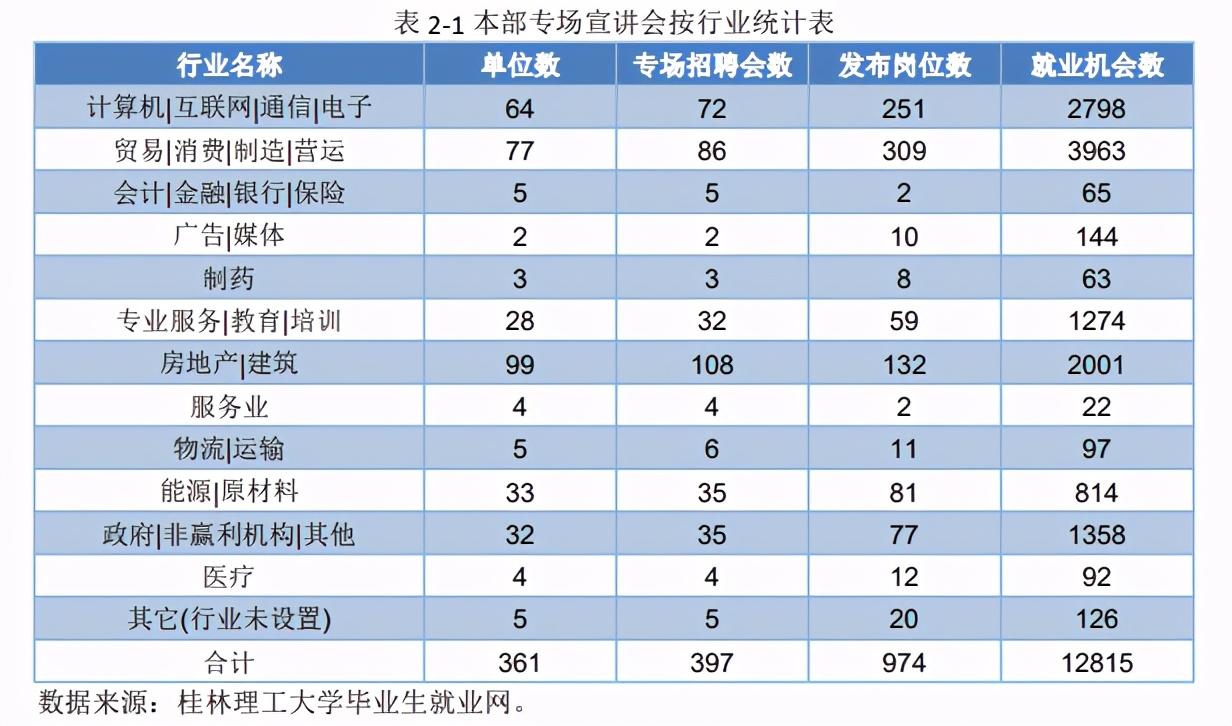 学校在屏风、雁山两校区为 2020 届毕业生共举办大型双选会 3 场,发布招聘岗位 2118 个,提供就业机会 17231 个。举办校园专场招聘会 397 场,发布招聘岗位1012 个,提供就业机会 12815 个。研究生院为 2020 届毕业生举办专场招聘会 23 场,提供就业机会 615 个。南宁分校为 2020 届毕业生举办大型双选会 1 场,提供就业机会 16263 个,举办专场招聘会 132 场,提供就业机会 8741个。