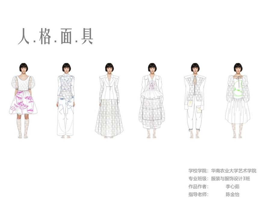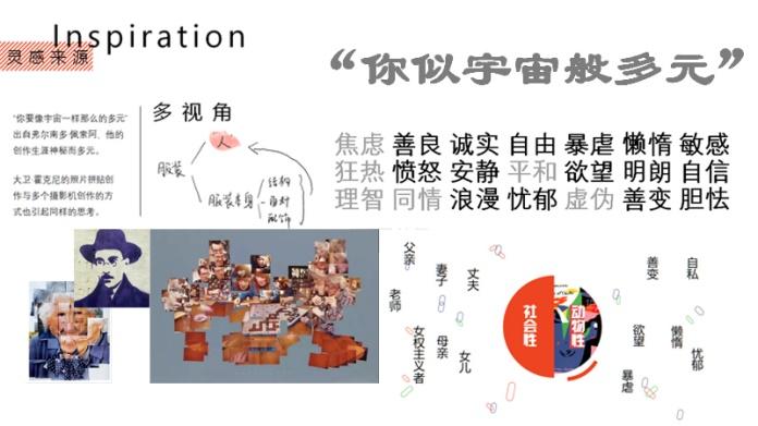 灵感来源是讨好型人格,讨好型人格指的是讨好他人而忽视自己感受的人格,是一种不健康的心理状态。,讨好型的人格有着卑微、没自信、退缩以及敏感等特质,有着这种人格特质的群体习惯性给自戴上“面具”,会给自己建立一个人设,放弃去追求个人的独特价值,而去建造一个被人喜欢的人设,会经常覆盖另一个真实的自己。所以,这一次设计的核心是遵从自我内心出发,通过面具间内外的人格对比,运用真实与虚伪的碰撞,面具是作为一种中间衔接的分割线,是衔接真实与虚伪的介质,然后用抽象人像图案来表达面具之下的多层面孔。