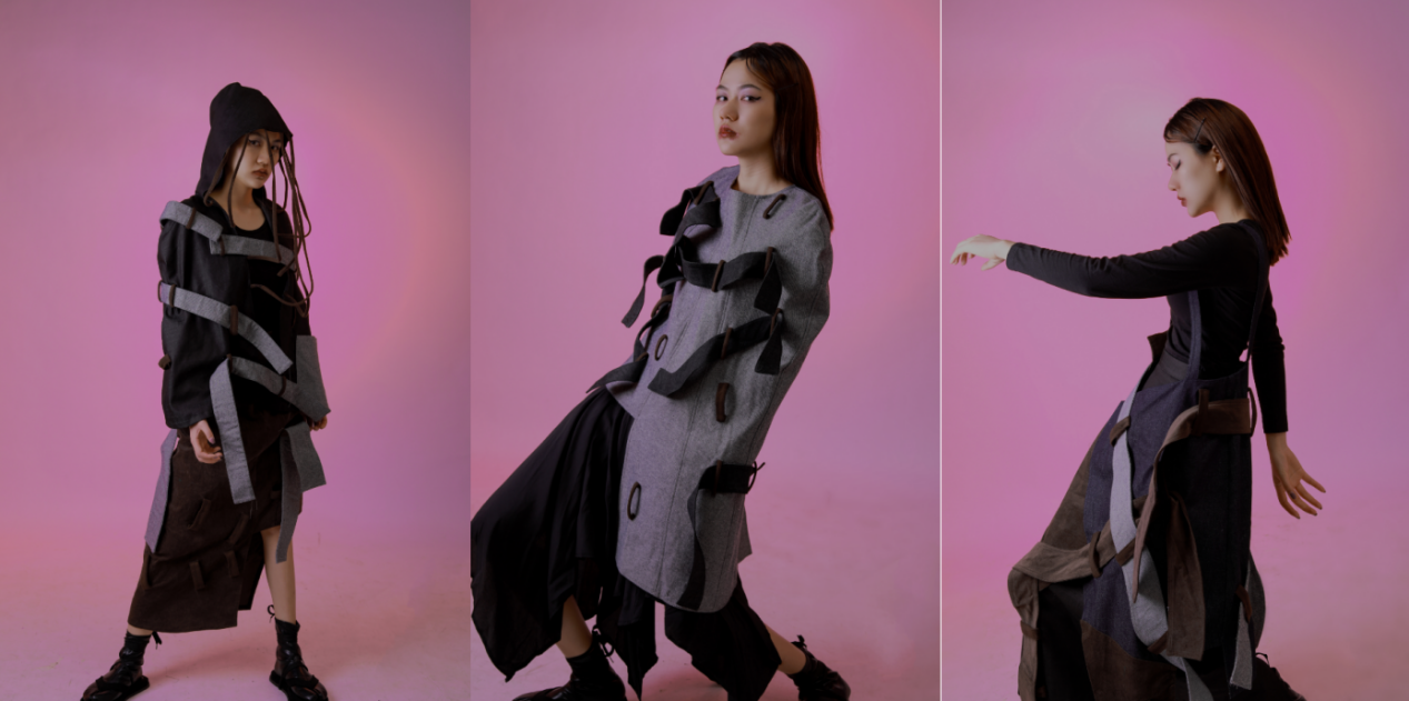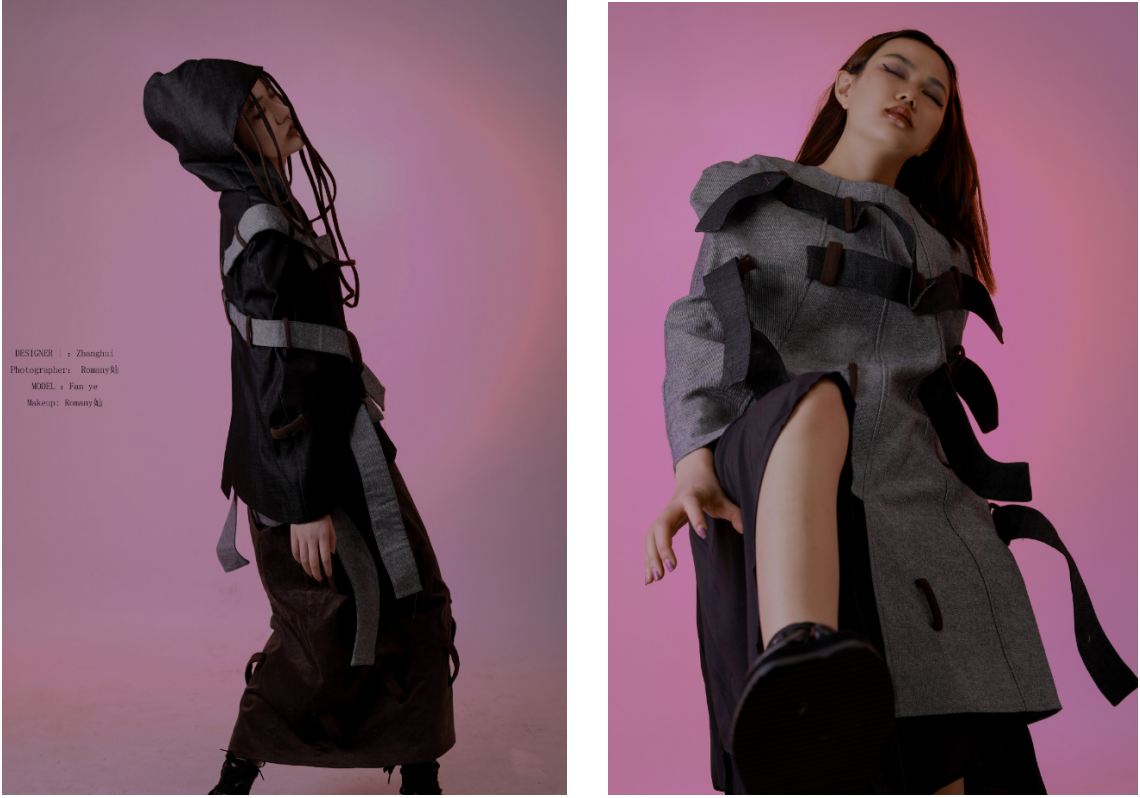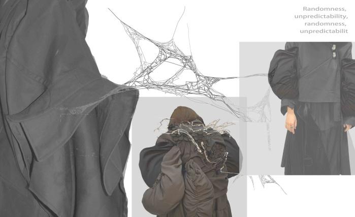 这次把设计主题定为“囚徒”是因为我选题的目的就是为了表现出当下社会部分人生活的常态,和这种极度压抑被强迫,被束缚的状态。现在的社会背景下,其实大部分人的生活水平和条件都是非常被动的。虽然大部分设计都是比较积极和向上的,但是我却想把人们被束缚的内心,和极度压抑的感觉表现出来,这是一种非常消极的情绪,让人觉得不舒服,觉得被限制,无法自由的做出选择,然而这正是目前很多人的状态。如果把这些元素利用到服装当中会是什么效果,如何把情绪呈现到服装上,是我这次的目的。