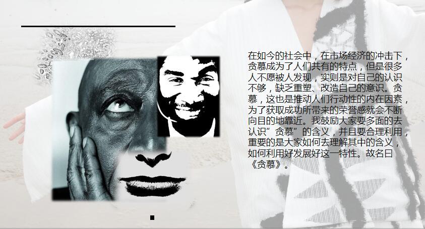 本设计的目的是倡导大家重新去认识“贪慕”,要敢于“改造、重塑”自己。这可以一股正能量,是推动人们行动的内在因素,因不满足而去做更多的改变,这是健康的。在我看来“贪慕”心态犹如水汽蒸发那般自然,只要是一个正常人都会有,重要的是大家如何去理解其中的含义,如何利用好发展好这一特性。