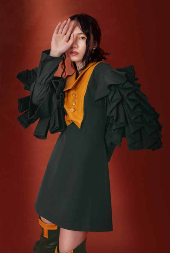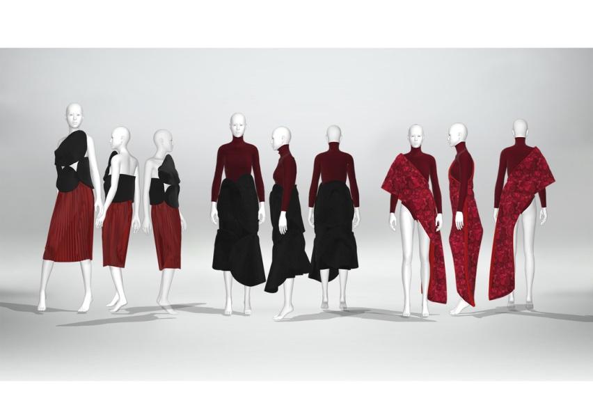 本系列以发现在中国北纬三十度未解之谜的三星堆文明为灵感,对青铜像面具图形元素进行提取,结合现代的审美,将历史文化与现代服饰相融合,让更多的人了解中国的历史文化,感受中华文化不一样的魅力。