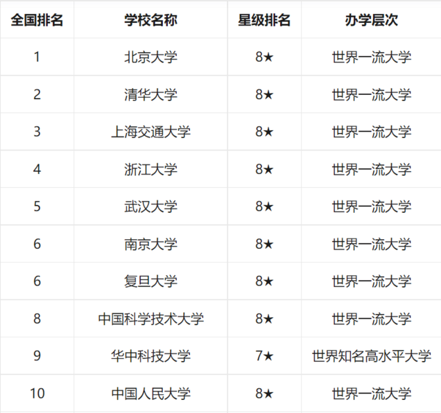而占据第6名到第10名的大学分别是:南京大学、复旦大学、中国科学技术大学、华中科技大学以及中国人民大学,其中南大与复旦并列第6名。