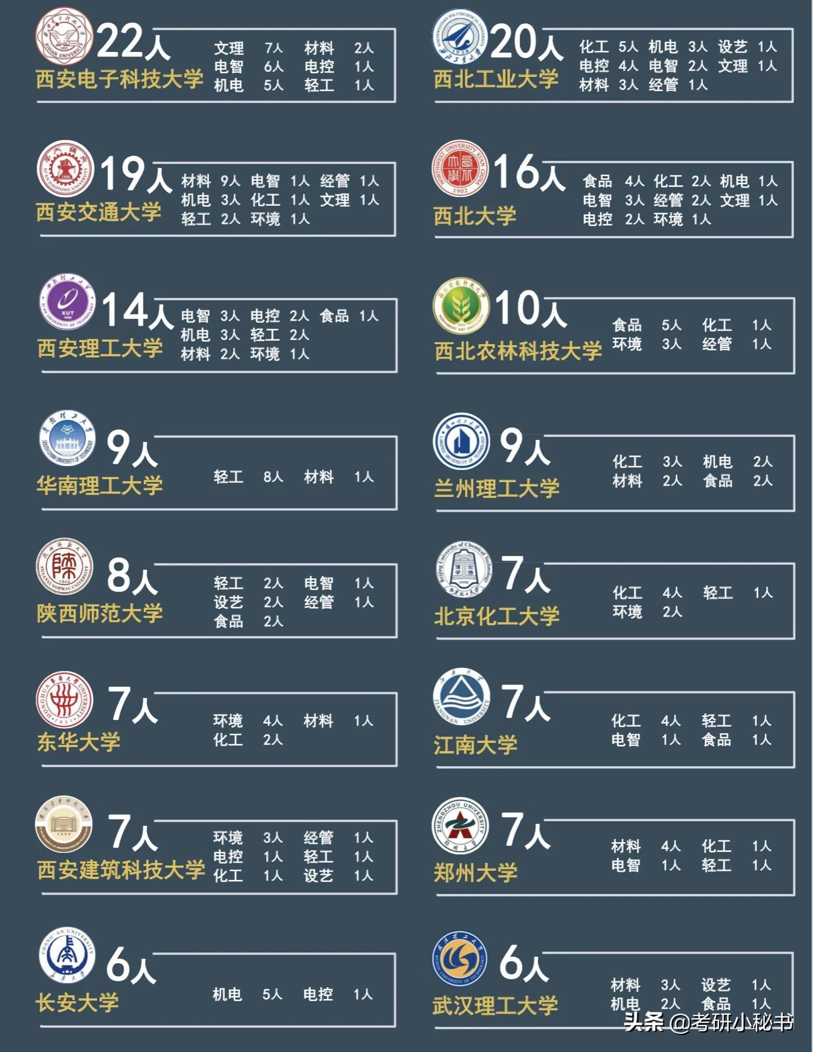 在选择升学的同学中,还有不少学生选择考入外校,其中有不少为985/211高校,上图中可以看到考入西安电子科技大学的有22人,考入西北工业大学都有20人,考入西安交通大学的有19人,考入西北大学的有16人,考虑华南理工的有9人。在下图展示的学校中,我们还可以看到考入不同学校的各专业人数。