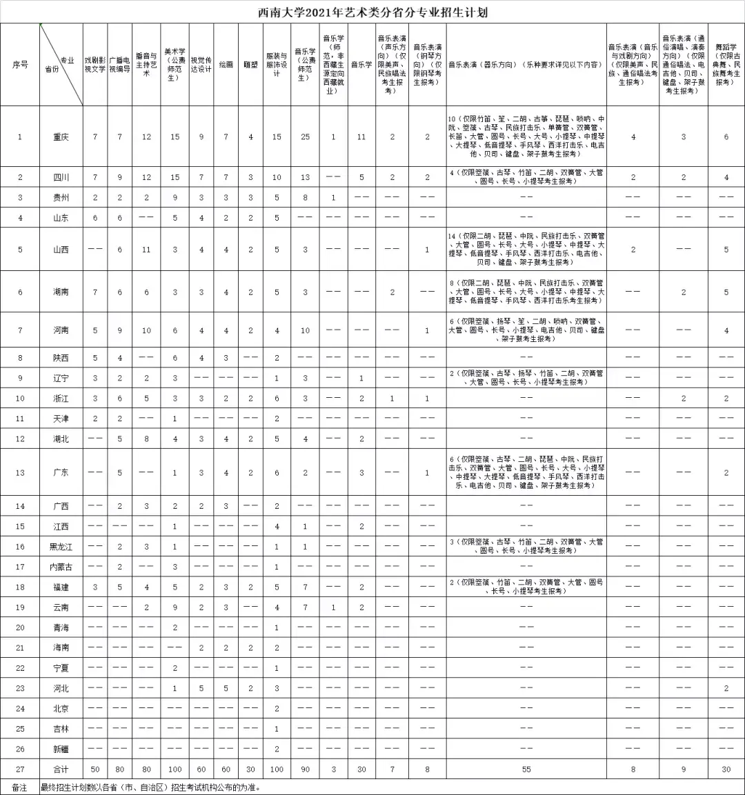 2021年艺术类招生专业为戏剧影视文学、广播电视编导、播音与主持艺术、美术学(公费师范生)、视觉传达设计、绘画、雕塑、服装与服饰设计、音乐学(公费师范生)、音乐学、音乐表演(声乐、钢琴、器乐、通俗演唱演奏、音乐与戏剧方向)、舞蹈学,总计划共800名,分省分专业招生计划详见附件1。