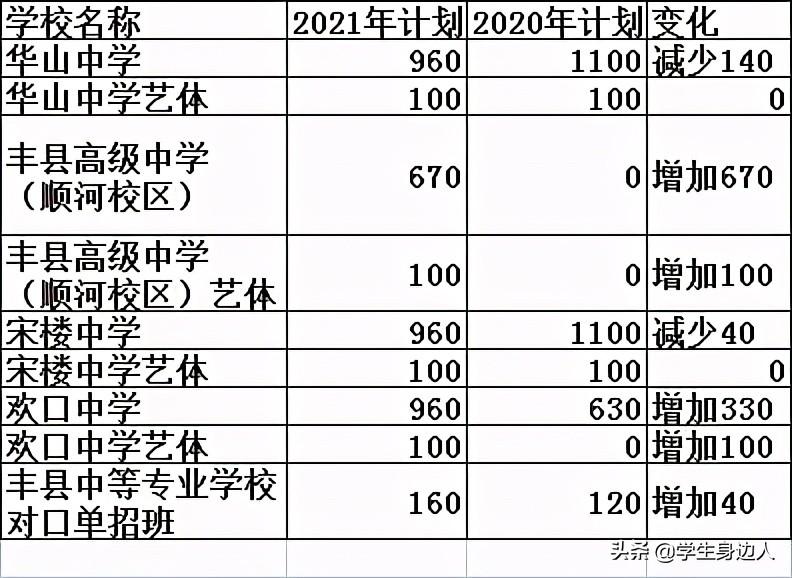 丰县教育局发布了《2021年丰县高中招生学校代码及招生计划》,与2020年招生计划相比变化不小,下面@学生身边人领着大家分析比较。