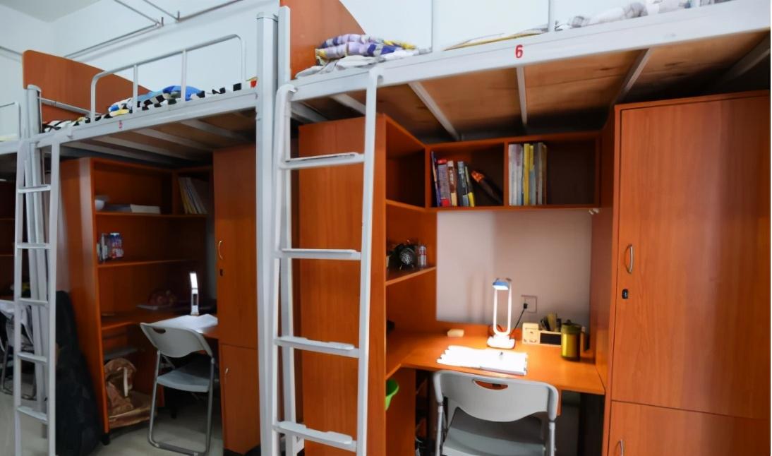 宿舍六人住一间,独立厕所与浴室,上下床,独立衣柜,无桌。