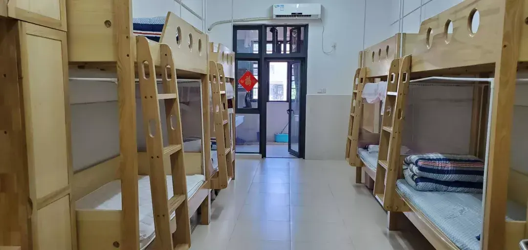 6人一间,带独立卫浴、阳台,有洗衣房。新宿舍都有一个生活阳台,配备独立储物柜、六张课桌和三张上下床。