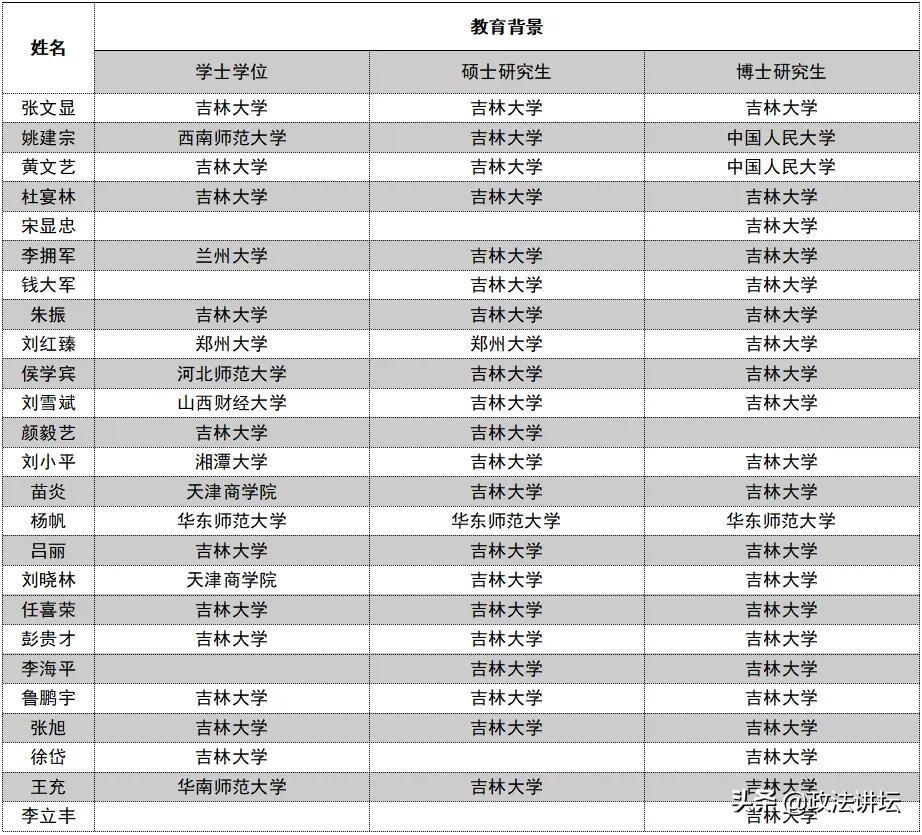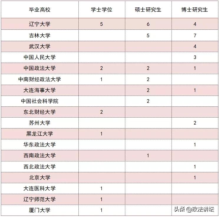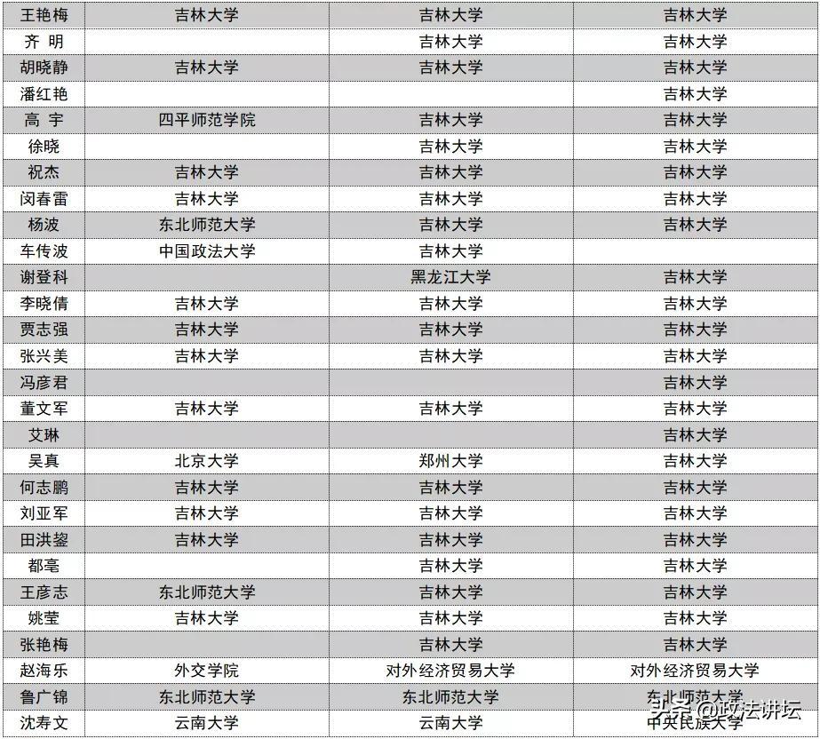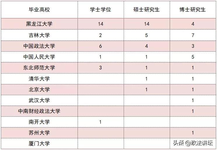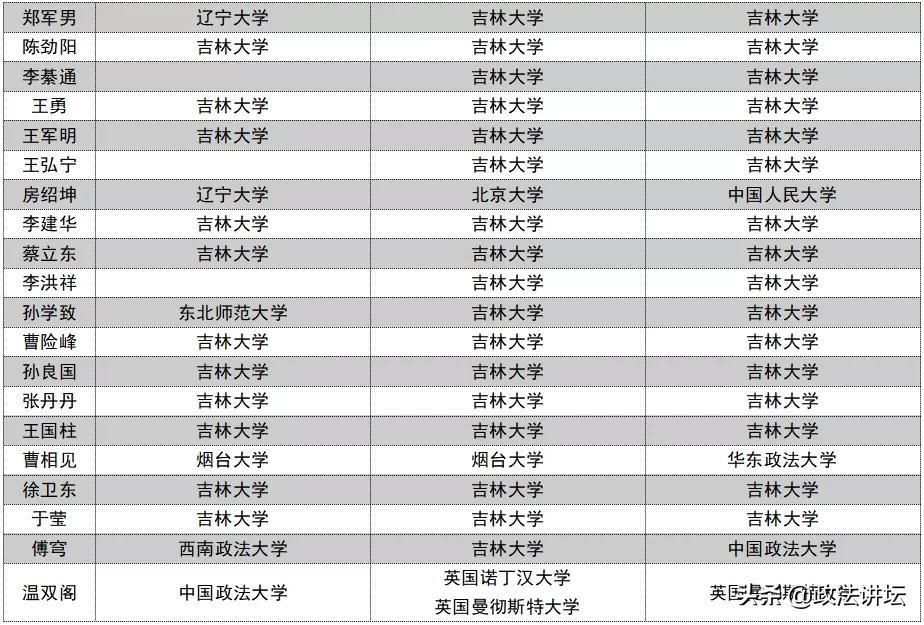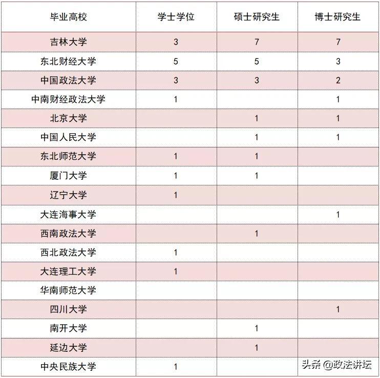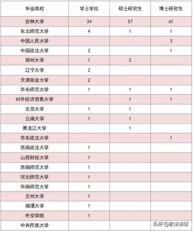 在吉林大学法学院的师资教育背景中,曾在本校就读的师资占了绝大多数。在吉大法学师资的本科毕业高校中,吉大尚未占据绝对优势,但其硕士以及博士学位研究生学位基本上均为吉大毕业,“自产自销”的比例极高。此外,吉大法学院的师资教育背景还受到一定的地域影响,有一部分教师曾就读于东北师范大学、辽宁大学等东北地区的高校。