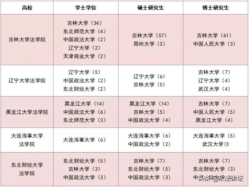 东北地区的五所法学院校师资情况都有着各自的特点。吉林大学法学院稳坐东三省法学教育的第一把交椅,其师资教育背景中“自产自销”的特色相当突出。而东北地区其他法学院校均不同程度地受到吉林大学法学教育的影响,有相当比例的法学师资曾就读于吉林大学。而在山海关以南的高校中,对上述东北地区法学师资影响最大的高校分别是中国政法大学和中国人民大学。