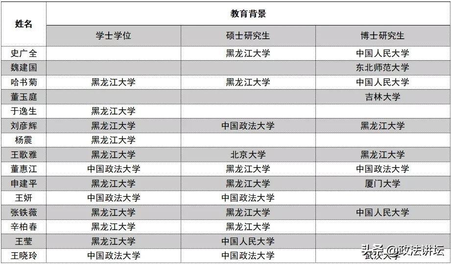 在黑龙江大学法学院的师资教育背景中,其师资本科、硕士学位均以本校就读为主,而博士学位则主要在吉林大学取得。与上述辽宁大学法学师资相同之处在于,黑龙江大学法学院中有相当一部分师资曾就读于中国人民大学与中国政法大学,这两所高校对于东北法学教育的影响由此可见一斑。