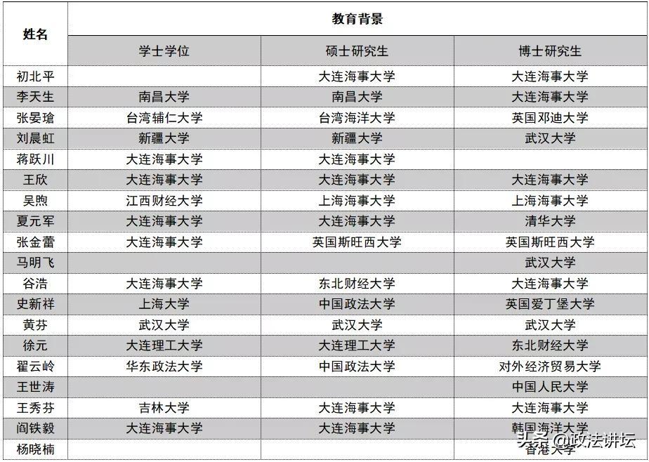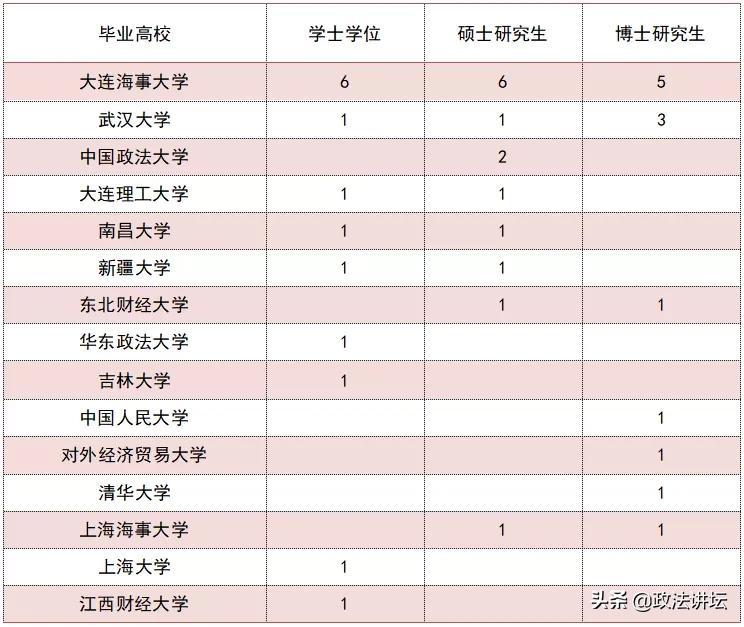 大连海事大学法学院的师资教育背景主要以本校就读为主。仅从师资毕业高校情况来看,其受到地域的影响并不大。作为一所以国际法为优势学科的法学院,大连海事大学法学师资中有相当一部分成员来自国际法强势法学院——武汉大学法学院。