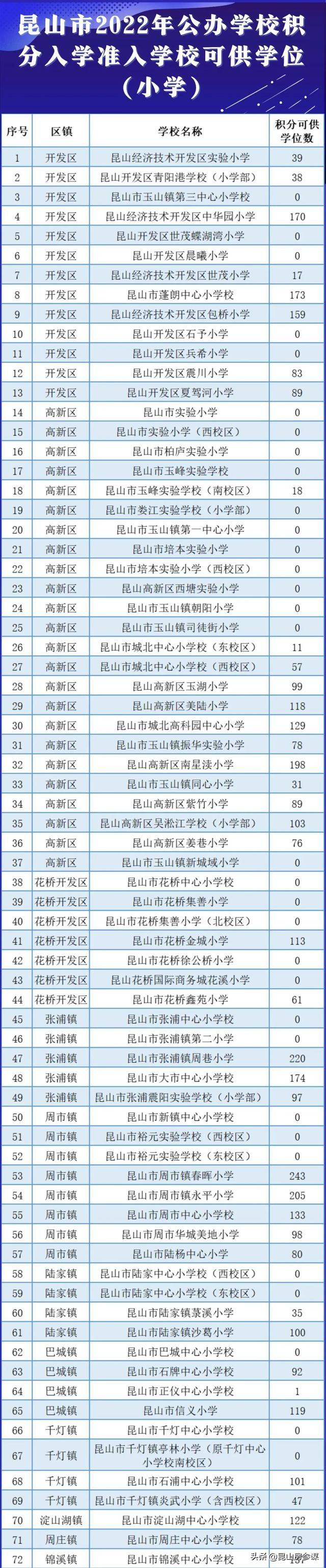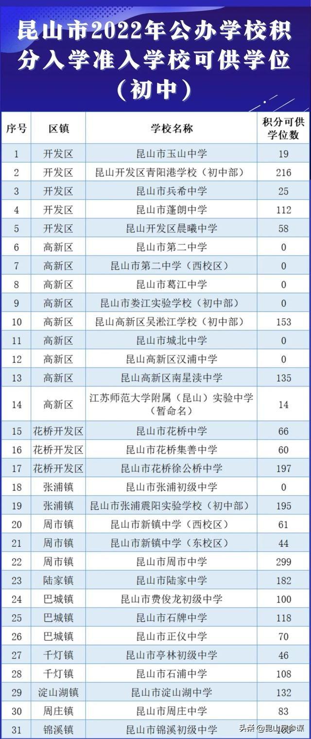 根据今天昆山官微通告的关于【2022年新市民子女公办学校积分入学准入学校可供学位】公告中可以看出昆山2022年度秋季全市公办中小学其中小学72所小学其中31所,不过其中昆山全市公办小学72所其中32所零可供学位,初中全市31所其中7所零名额