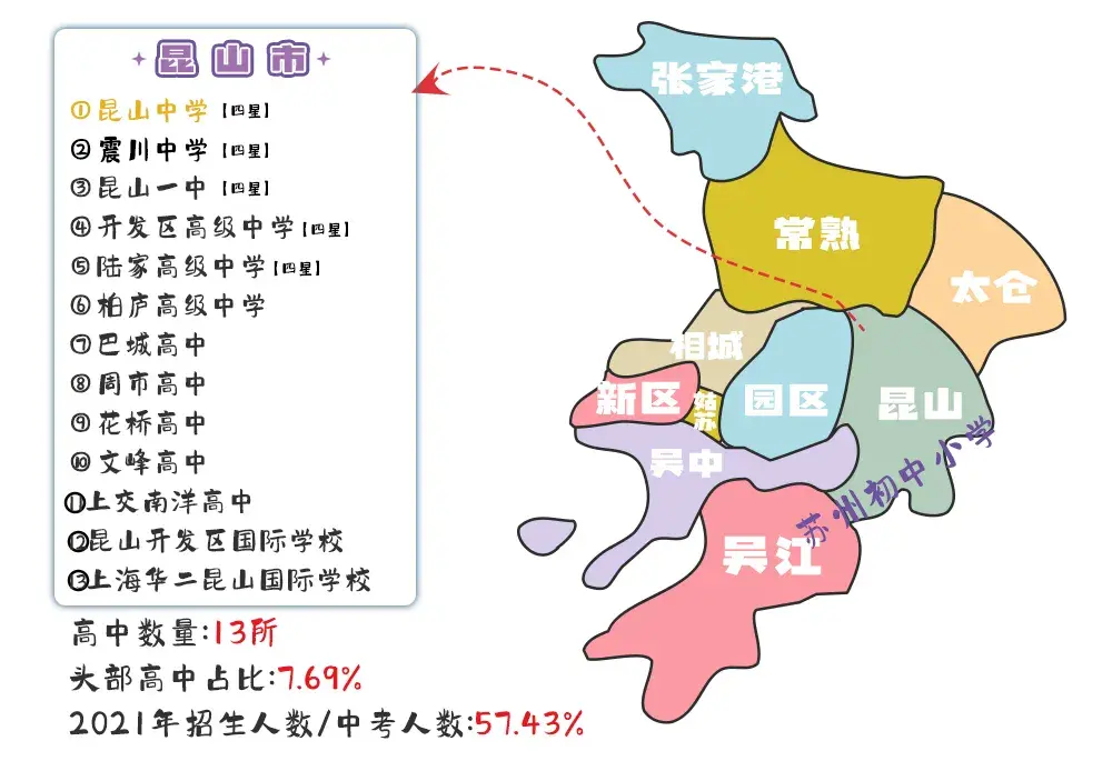 其中四星高中共5所,2020年高考本一率达80%+是昆山中学。