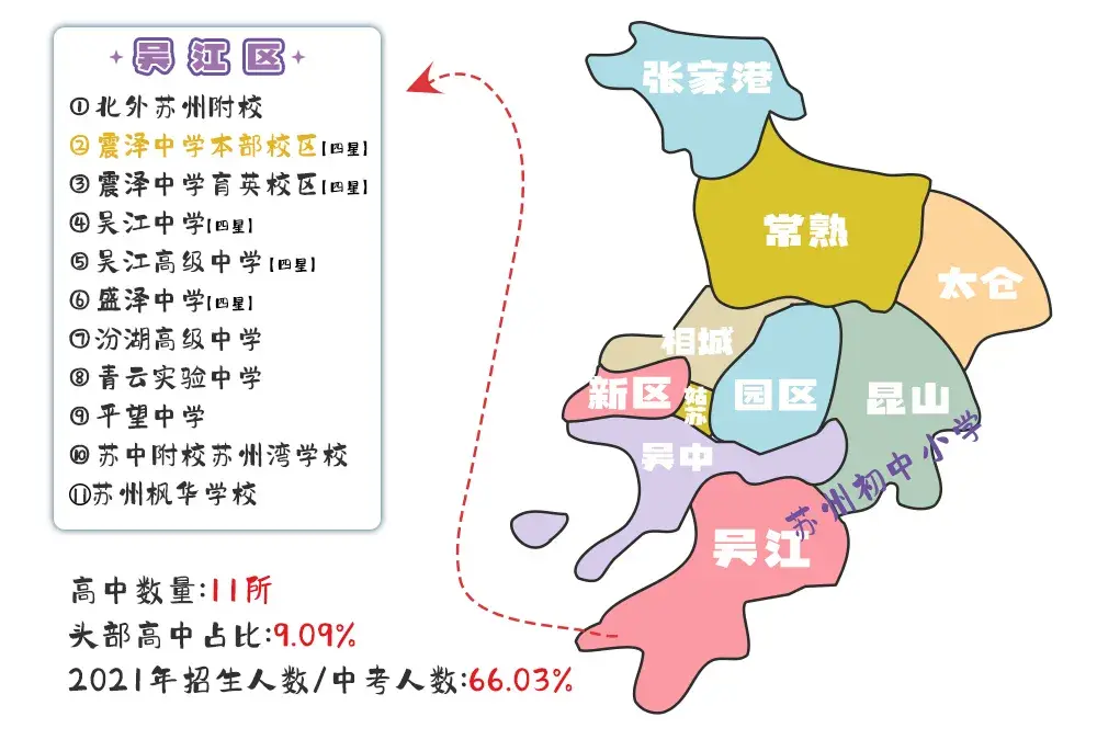 吴中区共有高中8所,2所私立高中有体制内:西交利物浦附校和北美高中;其中四星高中共4所,2020年高考本一率达80%+是木渎高级中学。